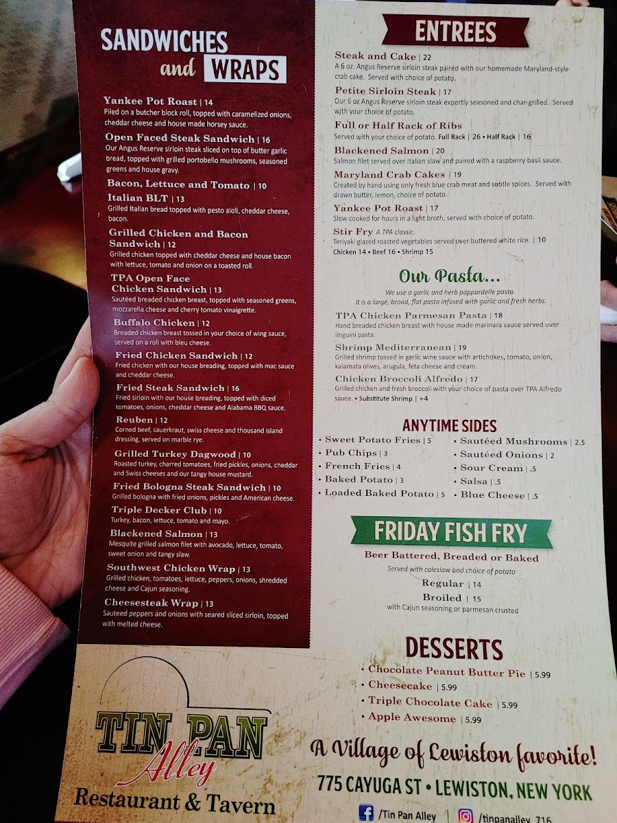 Welcome to Tin Pan Alley, a delightful eatery nestled in the heart of Lewiston, NY, at 775 Cayuga St. This vibrant spot promises a culinary journey that captivates both locals and travelers alike. Renowned for its Fish Fry Fridays, patrons can indulge in an array of fresh seafood dishes including Beer Battered Fish Fry, Parmesan Baked Fish, and the exquisite Lobster Haddock.